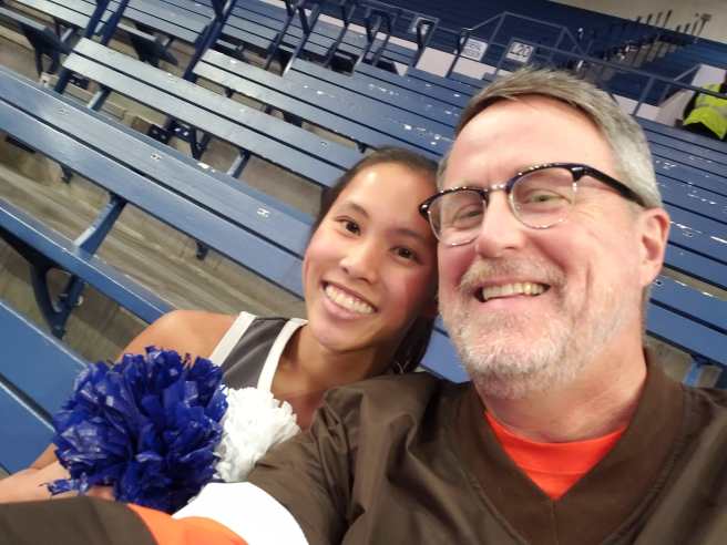 By the time Cate and I rolled out of bed, Noah was long gone, headed toward a connection in Charlotte that would take him home. We went to one of my favorite breakfast places, did a little shopping (always a favorite for her), then found a quiet spot in Arnold Hall to just talk a bit before she got ready to cheer at a men’s basketball game. I actually met the guy who sang the national anthem before the game and it turns out his wife went to my alma mater. What are the odds? I spent that game mostly looking for the best angle to get photos of her but the clock struck midnight for me at halftime. She ambled into the stands for one last hug and, of course, a picture.