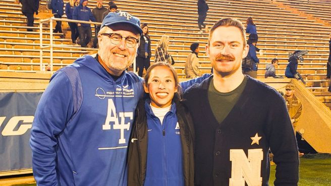 We made our way to the stadium and Noah got to see Catie cheer for the first time. Yes, this was her third season but the first time he was there to see it. That’s the way schedules work when your kids are in the military. The Air Force football team didn’t impress him but his sister’s display did, eliciting “wow” more than once. He managed to meet one of the exchange students from the Naval Academy, too. When the game ended, we made our way to the field for a photo I had been hoping to capture for a few years.